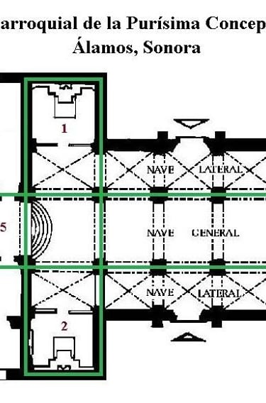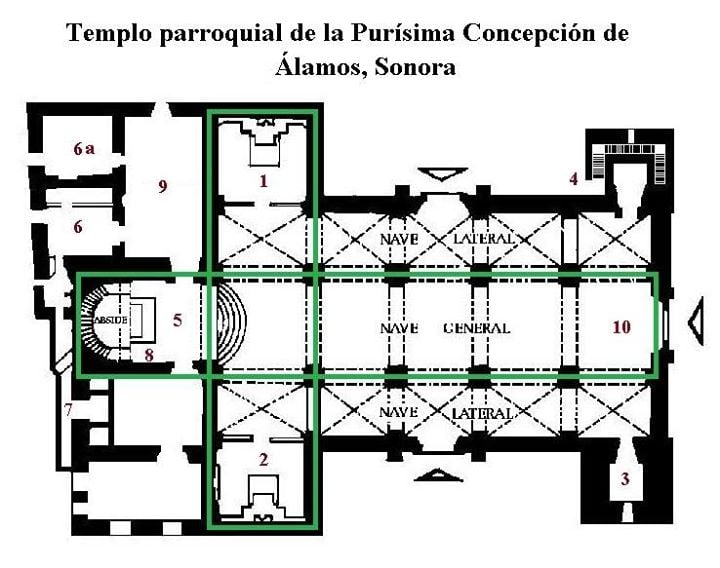 #5 - señala el área del altar, donde se supone que está sepultado Antonio de los Reyes, primer obispo de Sonora, Sinaloa y Californias, fallecido en marzo de 1787. En el ábside se levanta el ciprés en cuyo primer nivel podemos ver el manifestador y un crucifijo; luego, en el segundo nivel se encuentra la escultura del siglo XIX de la Inmaculada o Purísima (es decir libre de toda mácula o mancha) Concepción de María.