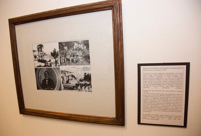 Las fotos de los carros alegóricos corresponden a los de los clubes sociales “Círculo Álamense” (inferior derecha) y “Club Unión” (superior izquierda). Se aprecia también una panorámica de la manifestación a su paso por la Alameda, donde se instaló un templete y se dijeron sendas oratorias. La imagen de Juárez, es un óleo a blanco y negro que realizó el pintor Santoyo, expresamente para Palacio Municipal (junto con otros tres más de Hidalgo, Allende, y Zaragoza) a principios del Siglo XX y que por fortuna y por milagro todavía se conservan en presidencia municipal.
