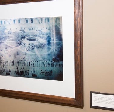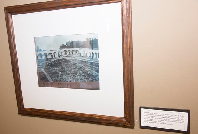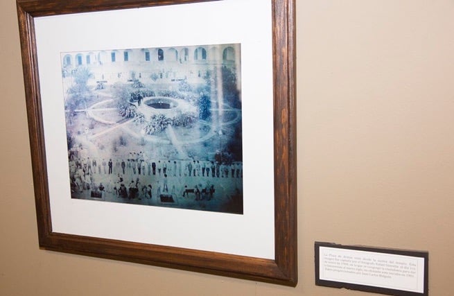 In this photograph taken in the 1880s the Plaza de Armas has a much more primitive appearance, with stone benches on the contour and center and a base which was probably the atrial cross, or center point of the plaza. In the background are the ruins of the portal arches of the corner house at Kissing Alley, which was remodeled during the Porfiriato.