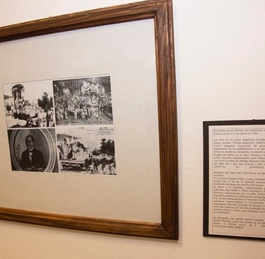 Two of the photos above are of floats prepared two social clubs of Álamos. At bottom right is the “Circle Álamense” display, and the “Union Club” float is at the upper left. At upper right is an overview of the demonstration passing through the Alameda, where the bandstand was installed and where speeches were made and appreciated. The image of Juarez is a black and white oil painting made in the early 20th Century by Santoyo specifically for the city hall, along with three more of Hidalgo, Allende, and Zaragoza. Fortunately and miraculously, these paintings are still kept in Álamos city hall!