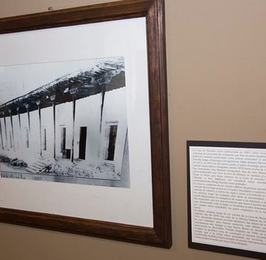 The Mint consisted of an old buildihng with thick adobe walls surrounded by a large portal in a square shape with wooden pillars and arches, amapa ceiling beams, with poles at office entrances. There was a warehouse and workshops behind the steam engines making the coins. The house assayer had the highest position in the building. Dominating the building was the high brick fireplace, which expelled the gases which originated in the smelting.