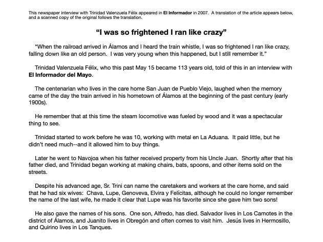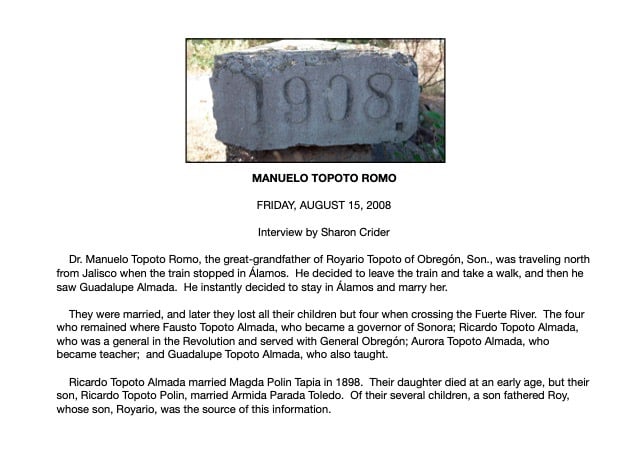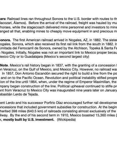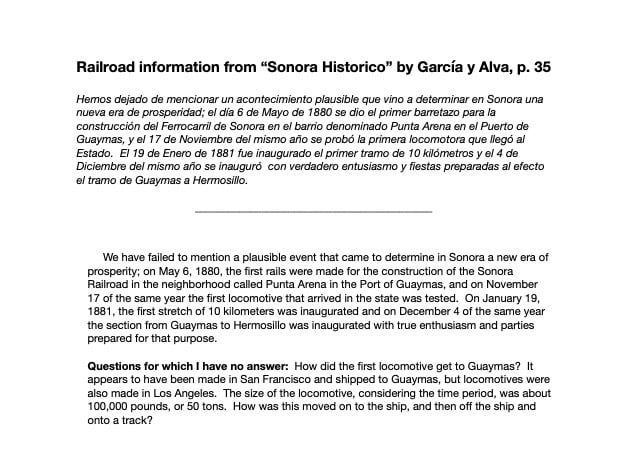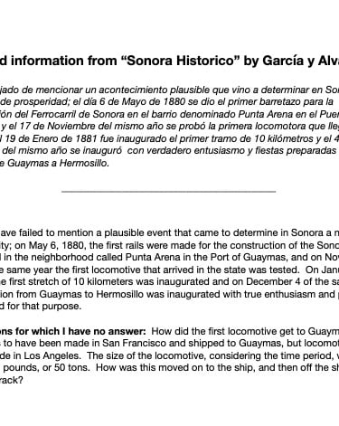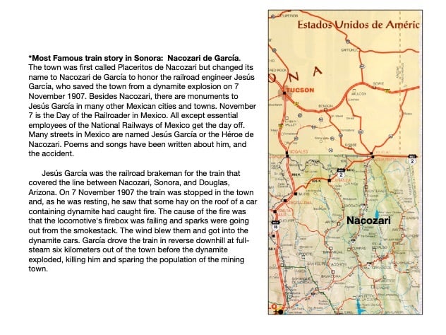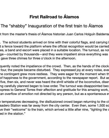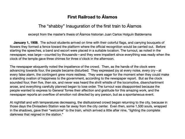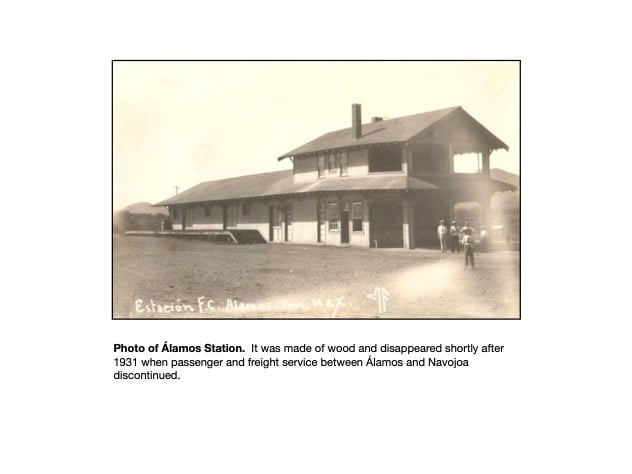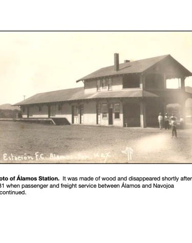 The first locomotive arrived by ship at Guaymas in 1880, and the first railroad line connected Guaymas to the capital city of Hermosillo. The railroad line from Navojoa to Álamos wasn’t completed until 1908, and passenger service was discontinued in the 1930s. Nothing remains today of the railroad or the station.