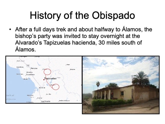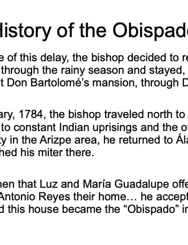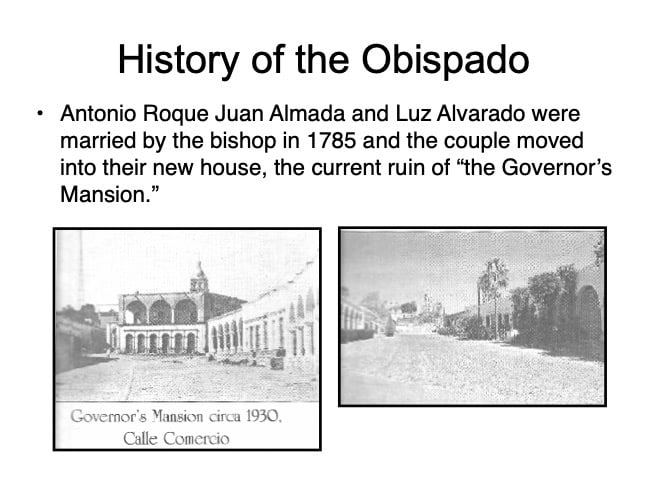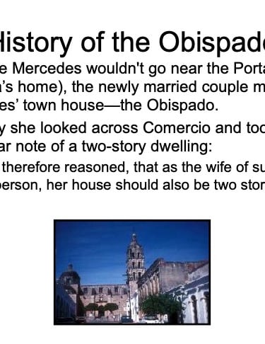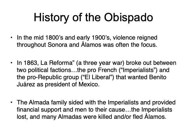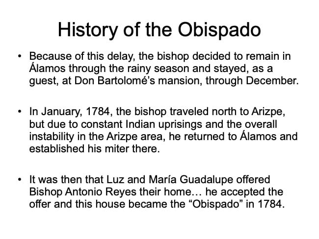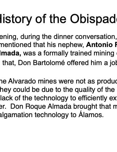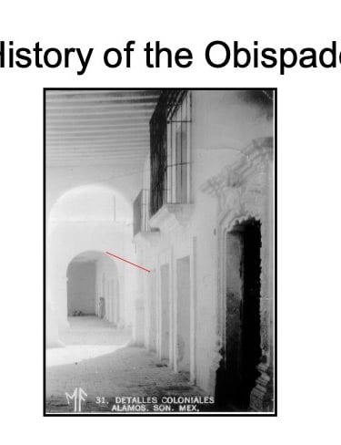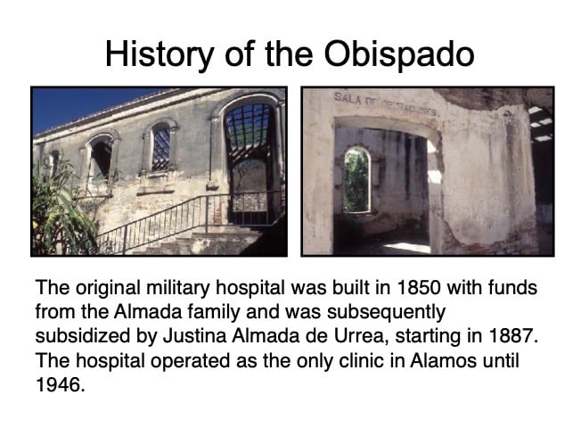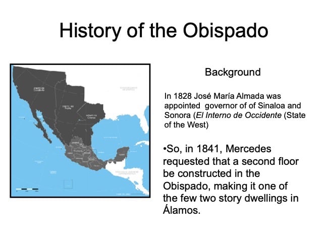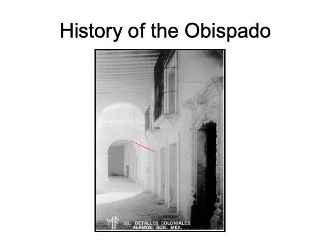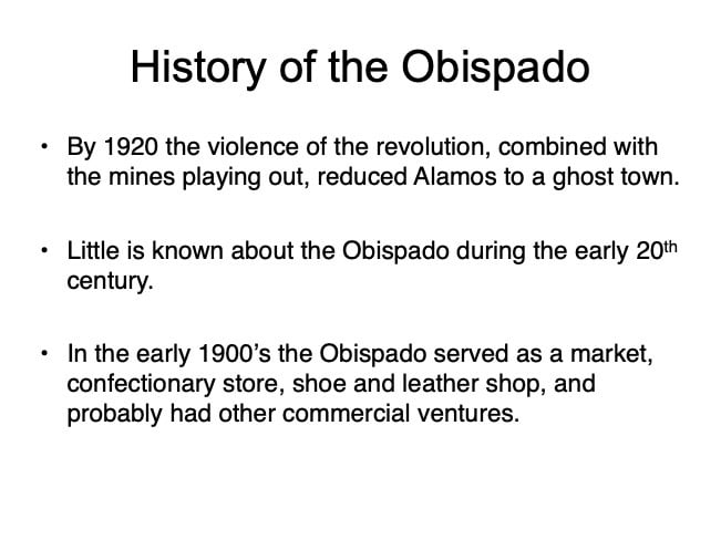 There are elements in the Bishop’s House both sacred and profane: “sacred” in that the first Bishop of the region, a large area encompassing what is now the Mexican states of Sonora, Sinaloa, and Baja California and the U.S. states of Arizona, New Mexico, Nevada, and parts of Oregon and Idaho, lived in this house from 1784 until his death in 1789, but “profane” in that it was also the 19th Century home of mine owner José María Almada’s mistress Mercedes, who demanded that a second floor be added to the structure in keeping with the homes of the “proper people” of Álamos.
