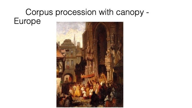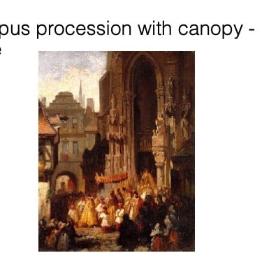 Citizens of the city cleaned the streets, spread sand, and scattered flowers on the path in preparation for the procession. Native Americans constructed a large that canopy that they erected to cover the center of the street. Buildings along the processional route were richly adorned with tapestries and silk or velvet cloth covered with painted images or scenes. For example, in 1697 the silversmiths’ guild decorated its streets with tapestries that depicted the conquest of Mexico. In addition to this decoration some confraternities and guilds built special altars. In 1683 ten such altars were erected. These were generally sumptuous constructions of silver decorated with large votive candles. Mirrors served as backdrops to enhance the Host when it was placed on the altar. Participants lined the steps to the altars with flowers. The procession stopped at each of these altars for the singing of special hymns. The procession also stopped at the entrance to the convent of Santa Clara [convent]. At one point, at the moment the monstrance reached the entrance, the nuns tossed thousands of incense-soaked bits of paper into the crowd in honor of the Host.