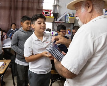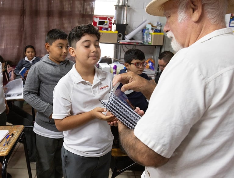 TOP: The Álamos Association published a textbook for fifth grade students in 2025, and in November David Warnest distributed the book to Revolución school students.