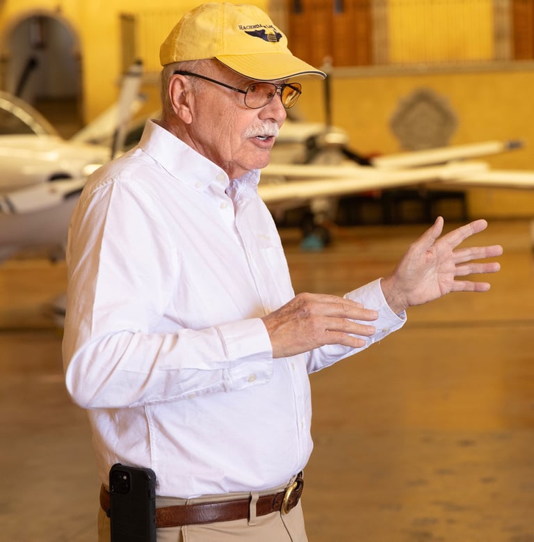 BELOW: Jim Swickard of the Hacienda de Los Santos Resort relates the history of the Álamos airport during a January, 2025, presentation at the airport's hangar. Jim has worked to modernize the airport since he came to Álamos in 1989.