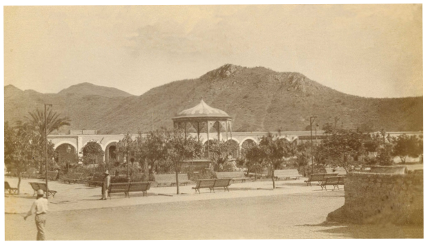 The Plaza Alameda, as we see it, already had trees on the side and appears to have the fountain in the center. The valued two-story house where until recently the Hernández family lived was not yet constructed, since this house was built by Don Pánfilo R. Santini during the first years of the 20th Century. Merchandise was sold behind the Robinson house, a place where goods were sold by ambulatory merchants before the market occupied this space. The Alameda at this time was not a defined space and covered with bricks, but a dirt-covered area with Popular trees planted lacking any precise order. It was not until the first of the 20th Century that the Plaza Alameda began to resemble what it has continued to be since that time.