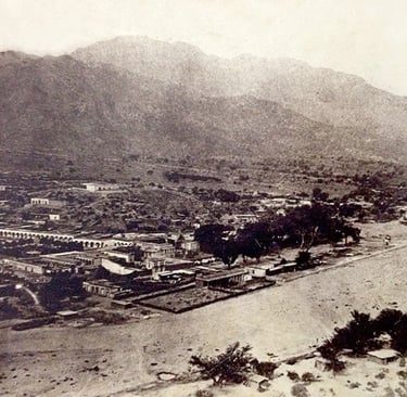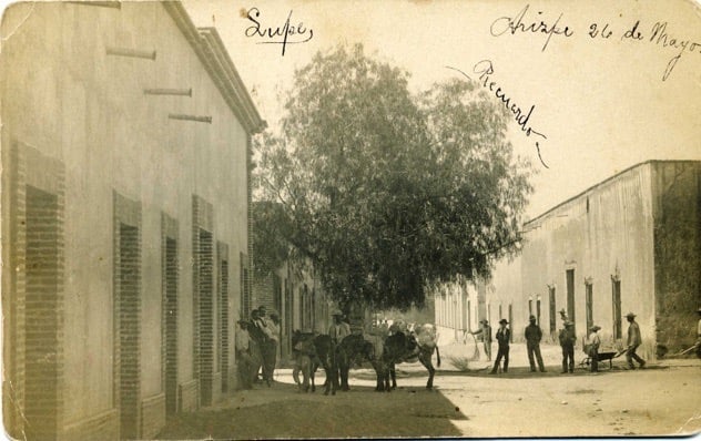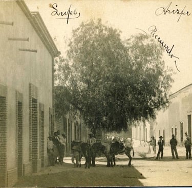 The Alameda teacher Miss Lolita Piña, writes to her boyfriend, my great-great-uncle, Guadalupe Sarracino (Lupe) as follows: "Four days ago we arrived at this [Arizpe, above] without news. On the way we suffered greatly because in addition to being a very long trip, it was painful. In Hermosillo we were very happy for five days because we did not stop walking for a moment." Writing about Arizpe, Miss Piña comments: "All this is very sad and I found it very ugly."