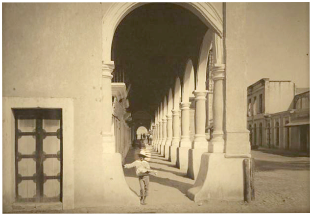 Un niño vendedor ambulante que quizá ofrecía melcochas o dulces, posa para la cámara en el extremo oriente del portal de la "Casa de las tiendas", donde tenía su despacho Ignacio L. Almada y en el extremo poniente se encontraba el Monte de Piedad San Miguel. Esta calle era conocida como la del Comercio, donde además de lo mencionado se encontraba la botica de Alberto Rosas (hoy casa Nuzum) y en la acera del frente la tienda de Rafael J. Almada y Hno., donde actualmente se encuentra la librería "Claret".