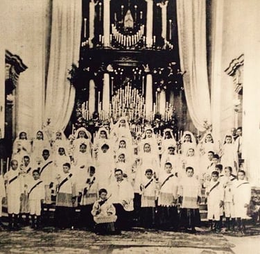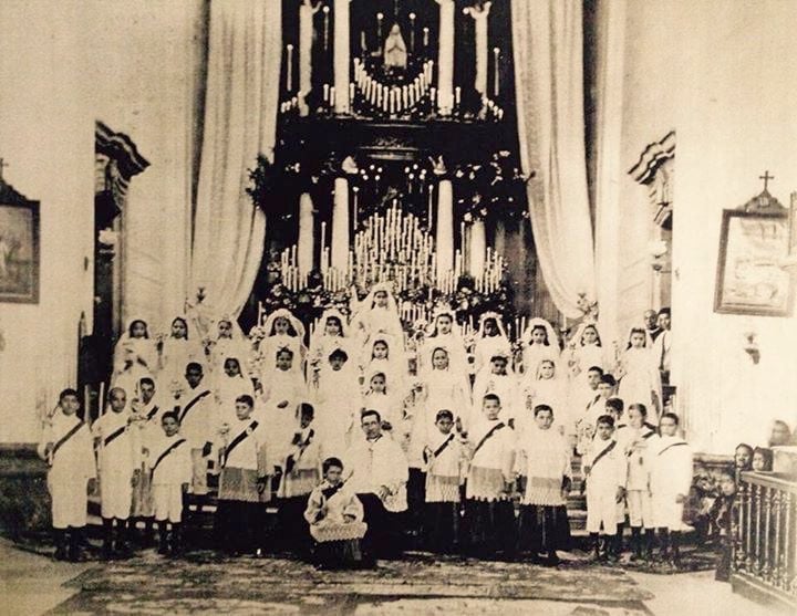 This photograph is from the early days of the 20th Century, and surely it was a first communion. To the right we can see the wooden railing from the original pulpit. Also we can see three oil lamps attached to the walls and two paintings from the original viacrucis. On the walls of the altar appears the lines of the original edging, which was altered during the altar’s restoration—which is a pity.