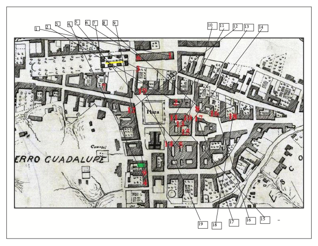 Plano con la ubicación aproximada de algunas tiendas y comercios del Álamos de fines del siglo XIX y principios del XX. No todas estaban en funciones al mismo tiempo, por ejemplo La Popular la tomo de un anuncio de 1893, mientras que “El amigo del pueblo” de uno del año de 1907. El mercado se subraya con amarillo y el palacio es el recuadro verde.
