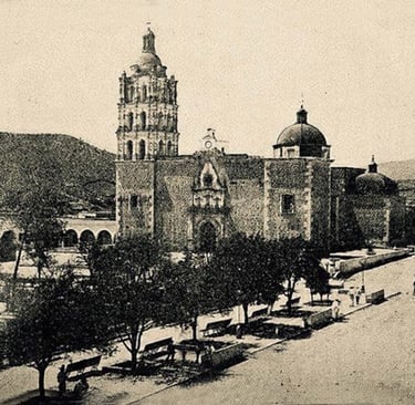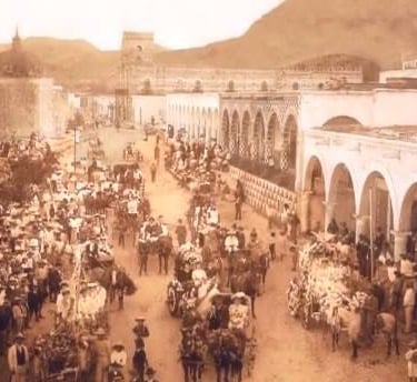The date and the event of this photograph are not known, although several observations can be made. Since the Álamos City Hall is completed in the background, we know the picture was taken after 1899, when el Palacio Municipal was inaugurated. It is obvious that the photograph shows a celebration—most probably an Independence Day observance in September pf the early 1900s. The event was important enough for a professional camera operator to record it, perched on the roof of a building on the north side of the Plaza de Armas. Film at that time required exposures of several seconds, so the absence of “blurring” dictates that all in the celebration were directed to look at the camera and not move. The clothing style and carriages show a population of wealth, so it is clear that this picture was taken before 1910 when Mexico’s revolution began.