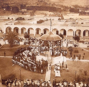 La Plaza de Armas en el año de 1906. Se observa al fondo el letrero de la Mercería de la Paz, y también un sencillo diseño pictórico sobre el toldo o techo del kiosco. Recargado en la banca un señor con el típico sombrero de la época, entre la clase popular. La original pertenece al archivo de la familia Sarracino Ramírez. En el reverso esta dedicada a Guadalupe Sarracino (tío tatarabuelo mío) por su novia la maestra Lolita Piña, donde recuerda el tiempo que pasaban juntos sentados en dicho lugar. Y también se ve le dátil hacia la izquierda.