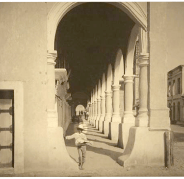 A street vendor who perhaps offered marshmallows or sweets, poses for the camera in the far east of the "Casa de las tiendas" portal, touching what is now the Bishop's House. This street was known as la del Comercio, (now Comercio) where in addition to the aforementioned was the apothecary shop of Alberto Rosas (now the Nuzum house) and or the sidewalk in front Rafael J. Almada and Hno. Store.
