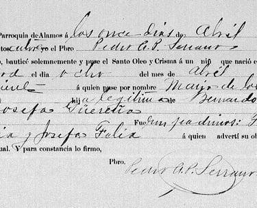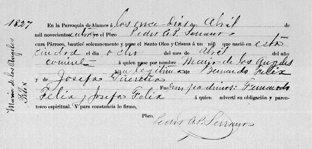 Born April 8, 1914, she was baptized in the parish of Álamos just three days later, according to the baptismal certificate which says: “In the parish of Álamos on the 11th day of April, 1914, I, Pedro A. Serrano, parish priest, I solemnly baptized and placed the holy oil and “chrisma” on a girl who was born in this city on the eighth day of the month of April of the current year, whom I named María de los Ángeles, the legitimate daughter of Bernardo Félix and Josefa Güereña. Her godparents were Fernando Félix and Josefa Félix, to whom I instructed of their obligation and spiritual kinship.” Why would the parents, if she had been born in Quiriego, would they have taken the newborn to Álamos three days after her birth to be baptized? The fact that the godparents were both residents of Quiriego rules out the possibility of a transfer because the godparents lived in Álamos. On what basis can those who claim she was born in Quiriego have when the baptismal record says that she was “born in this city?”