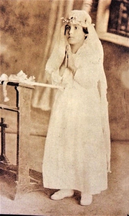 María Félix' baptismal certificate (above), her first communion (far right), and as she appeared in a 1947 studio portrait (right)